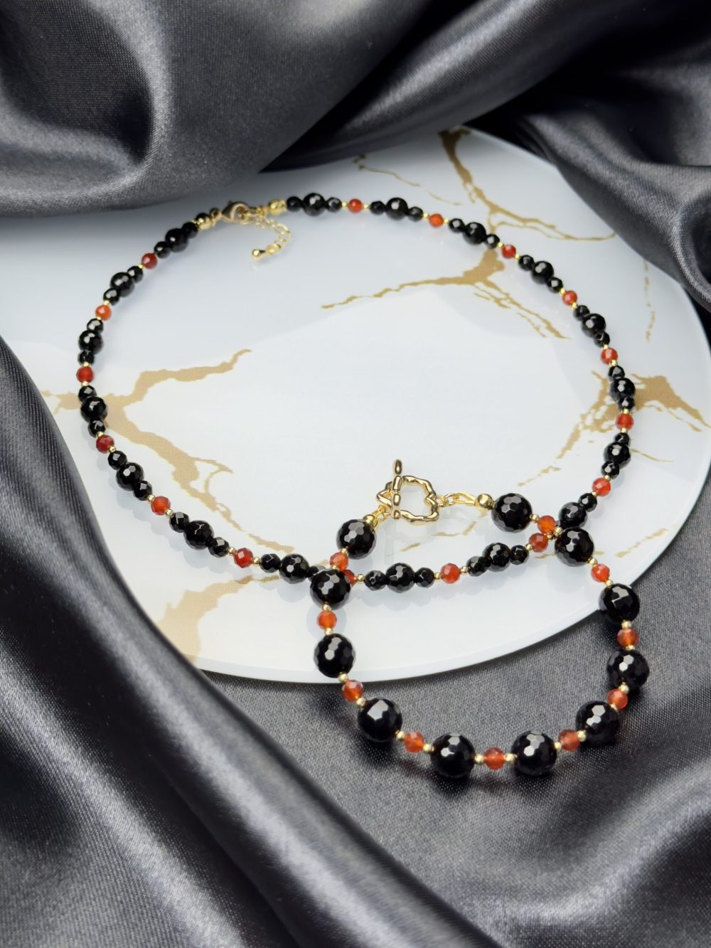Черный агат, густой и бездонный, как южная ночь, и сердолик, подобный каплям застывшего вина. Две стихии в одном ритме: бархатная мощь и огненное биение.