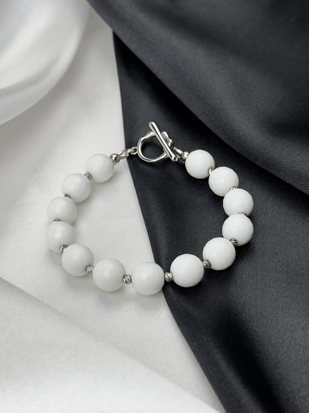 Браслет БЕЛЫЙ ЛЕБЕДЬ — это изысканное украшение, созданное из натурального агата в огранке. Его белоснежная чистота символизирует грацию и нежность белого лебедя, скользящего по воде.