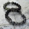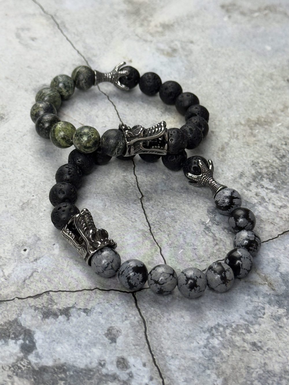 Браслет выполнен из натуральных камней – змеевика и вулканической лавы – и дополнен харизматичными вставками из нержавеющей стали в виде головы и когтя дракона.