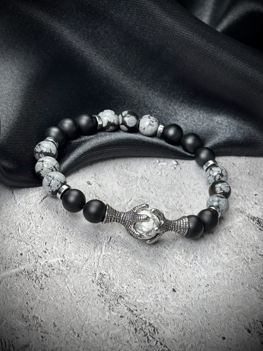 Это уникальное украшение, вдохновленное магией и величием драконов. Он изготовлен из натуральных камней: снежного обсидиана, черного матового агата, гематита и магнезита, каждый из которых обладает своими особыми свойствами.