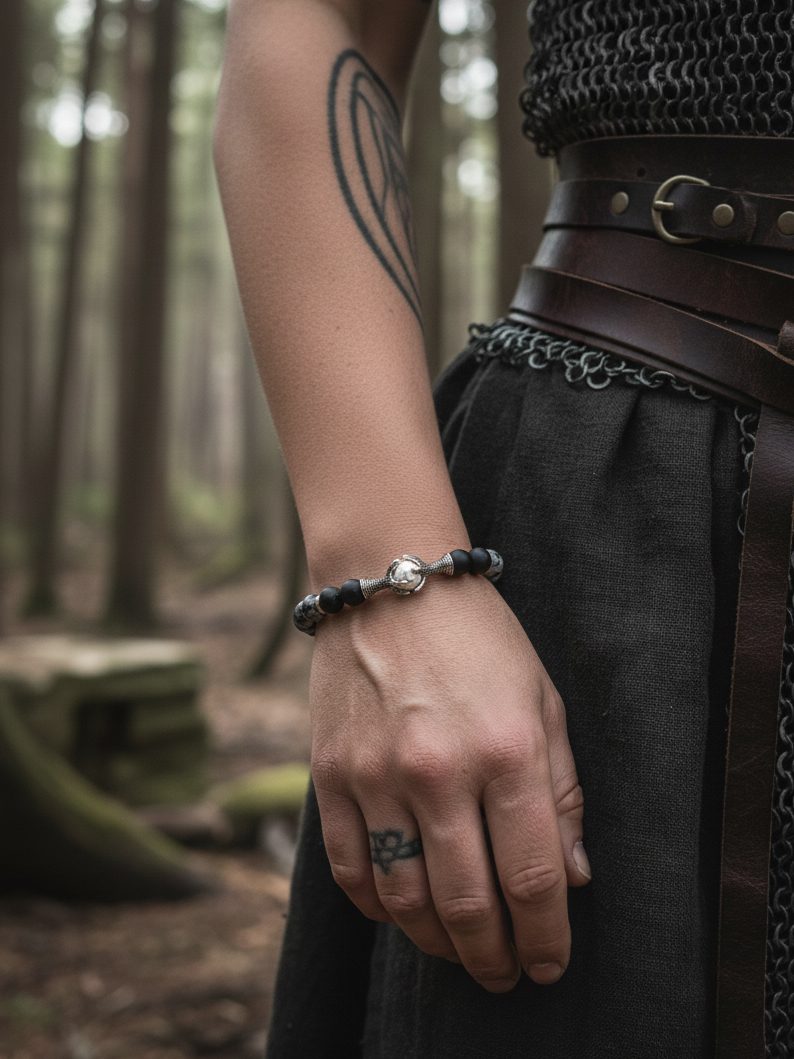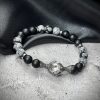 Снежный обсидиан с его неповторимыми узорами символизирует стойкость и силу, а черный агат привносит энергию стабильности и защиты. Гематит, обладая способностью повышать уверенность, помогает владельцу сохранять внутреннее равновесие, в то время как магнезит способствует обретению гармонии и спокойствия в повседневной жизни.