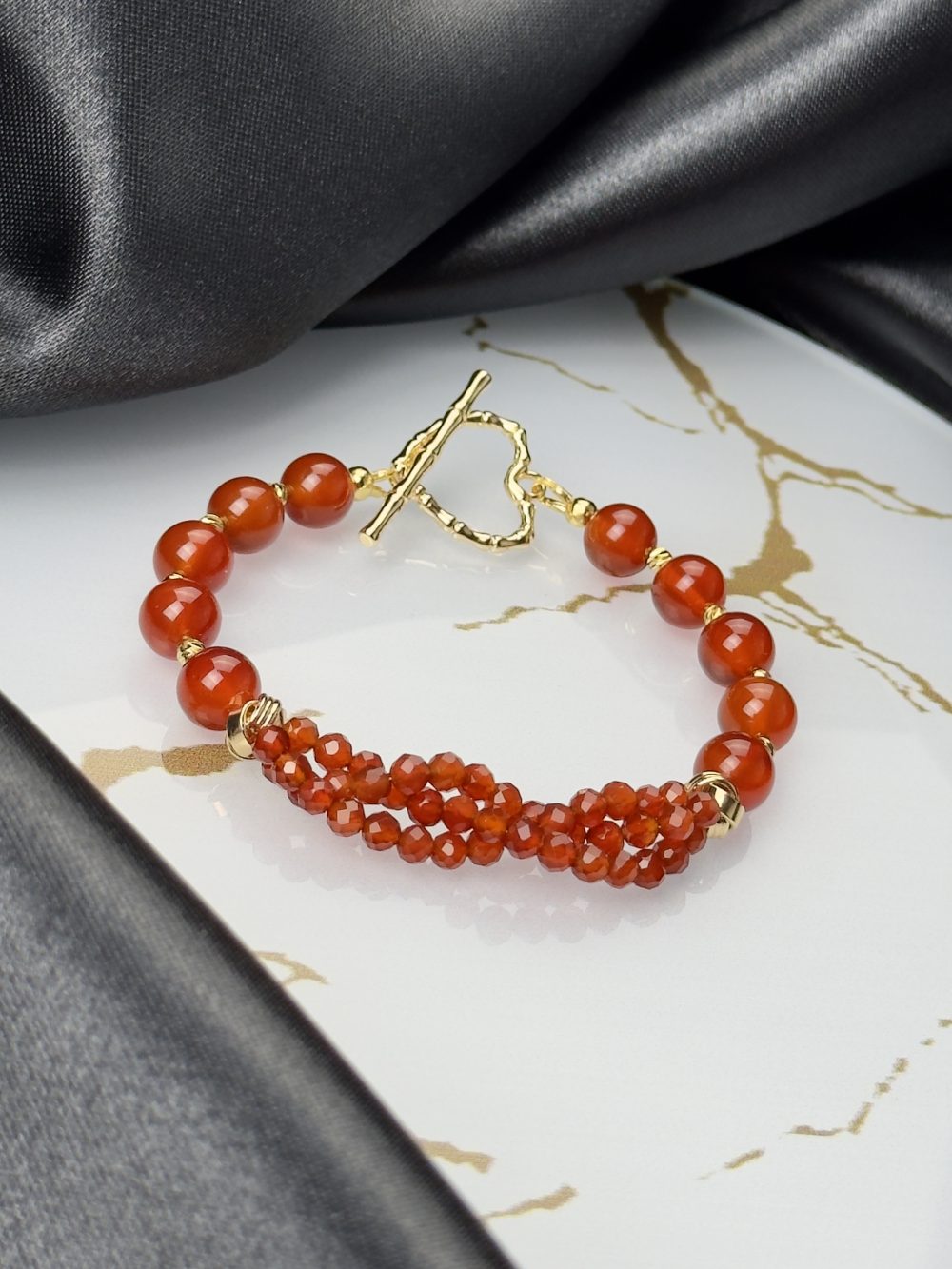 Изюминкой украшения является эксклюзивное плетение из сердолика в ювелирной огранке, которое придаёт украшению особый шарм и уникальность. А позолоченный замочек в форме сердца добавляет нотку романтики и утонченности.