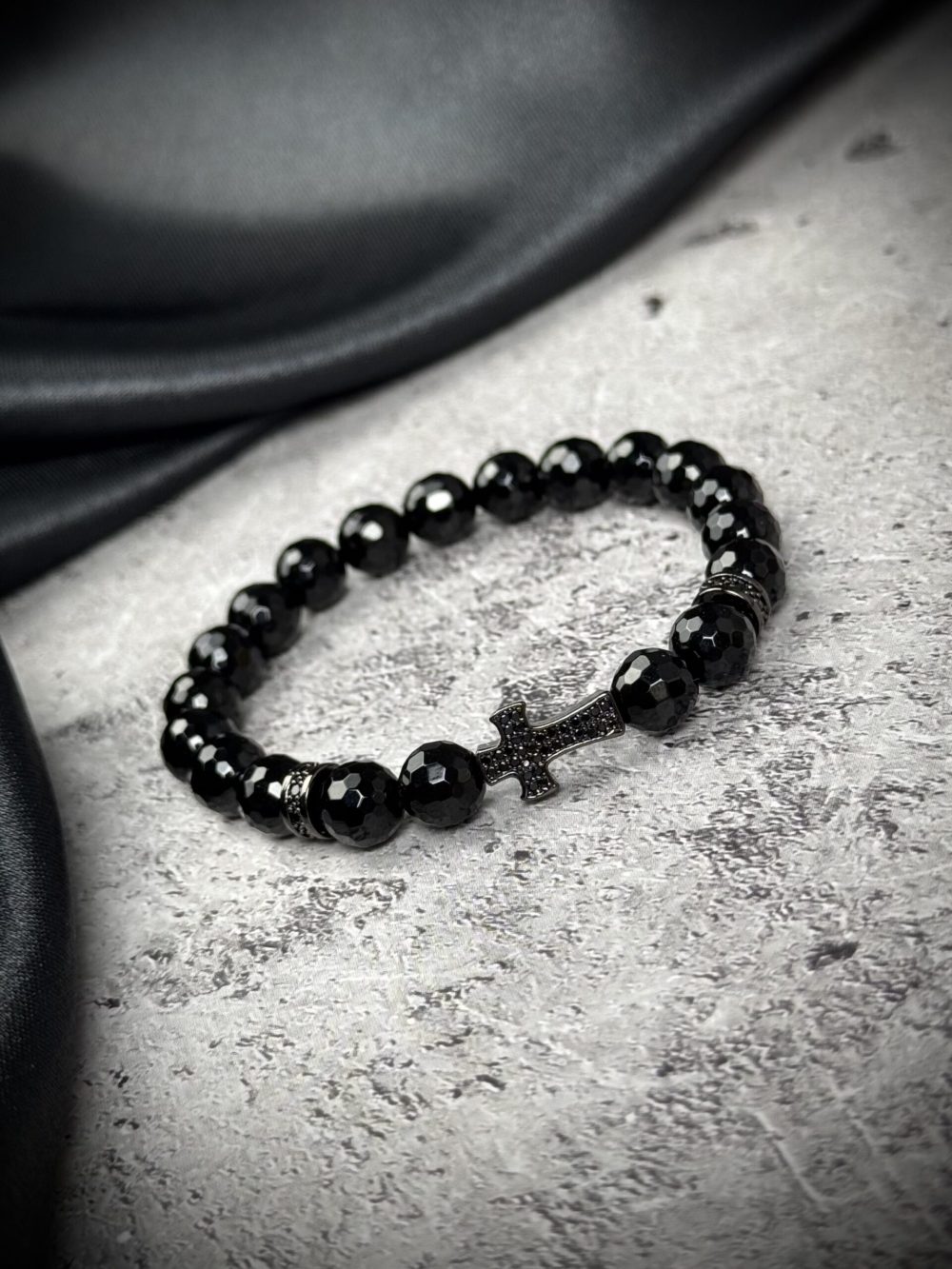 Браслет СИЯЮЩИЙ КРЕСТ — эффектное украшение, выполненное из натурального черного агата в сверкающей огранке. Это камень-защитник, дарящий незыблемое спокойствие и опору.