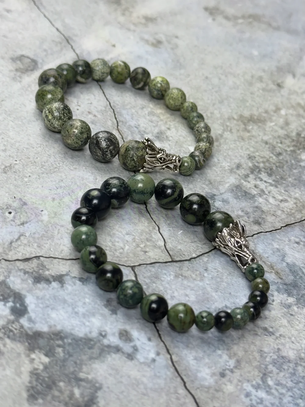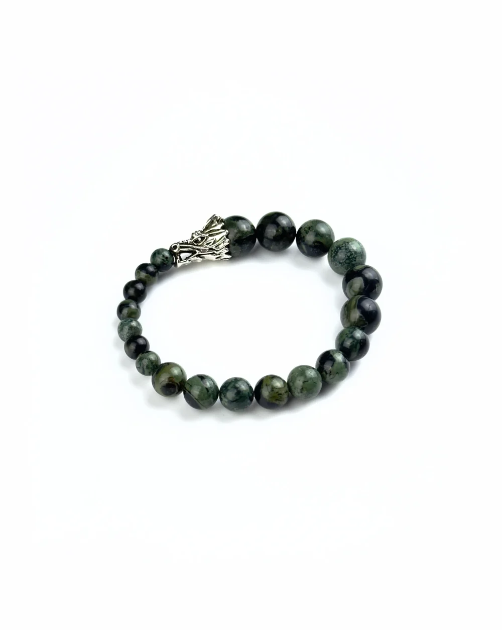 Браслет выполнен из натуральной зеленой яшмы и дополнен харизматичной вставкой в виде головы дракона.