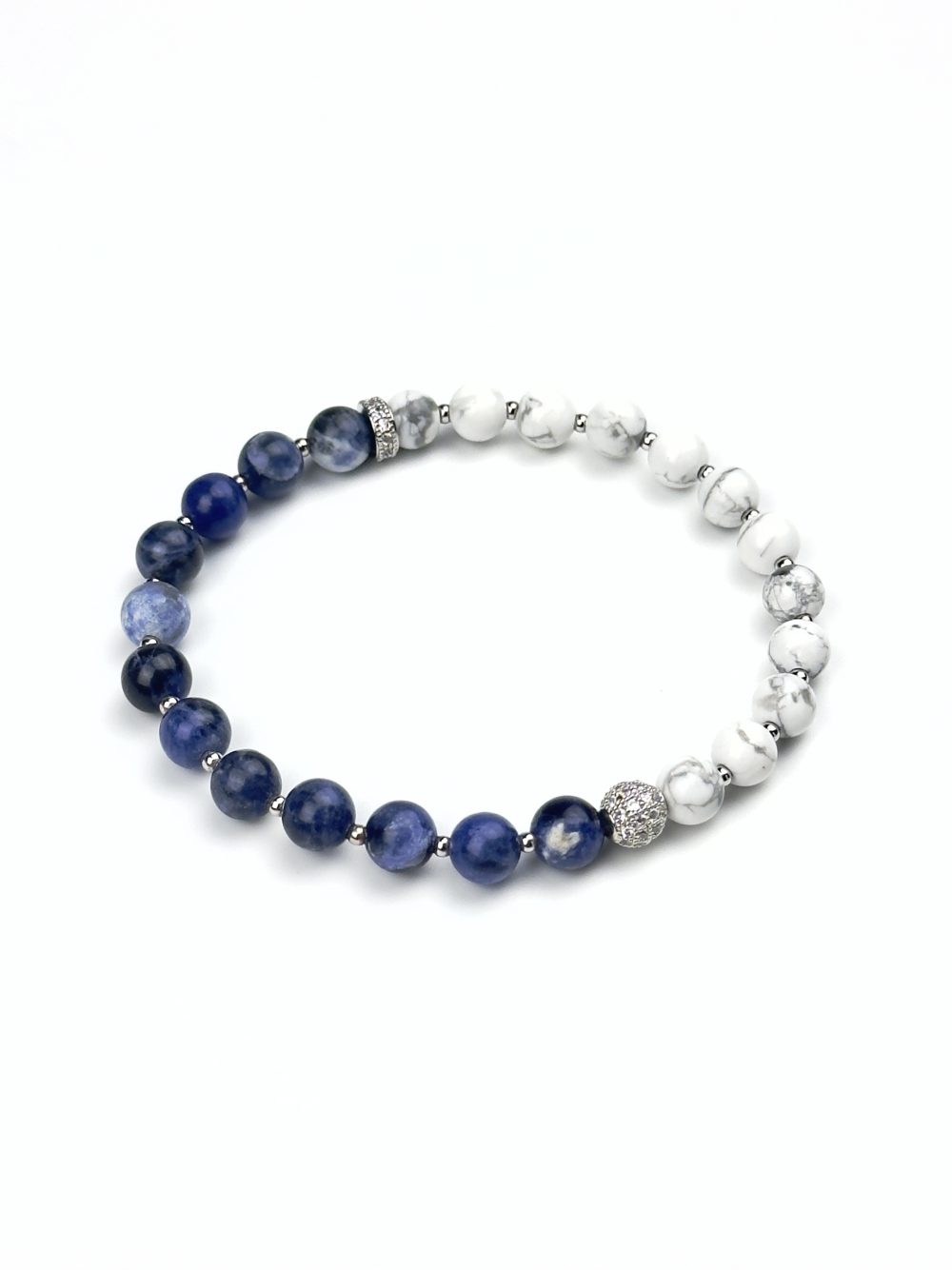 Содалит — медитативный синий. Камень интуиции, помогающий сохранять фокус и слышать внутренний голос. Магнезит — мраморная текстура зимнего пейзажа. Дарит спокойствие и ментальную чистоту, освобождая место для новых идей.