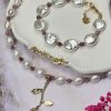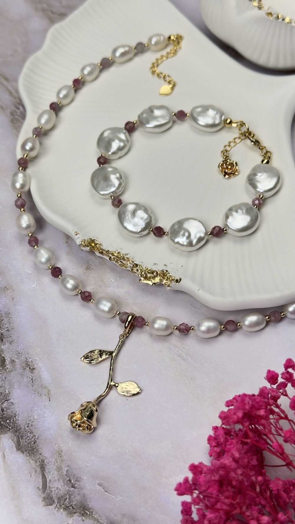 Браслет выполнен из жемчуга майорка премиального качества и натурального розового турмалина в ювелирной огранке. Изделие дополнено изящной подвеской в виде золотой розы.
