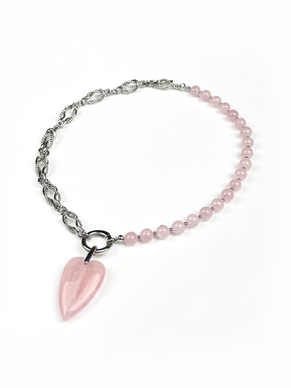 Подвеска в виде крупного сердца, также выполненная из натурального розового кварца, добавляет в образ эффектности и шика.