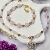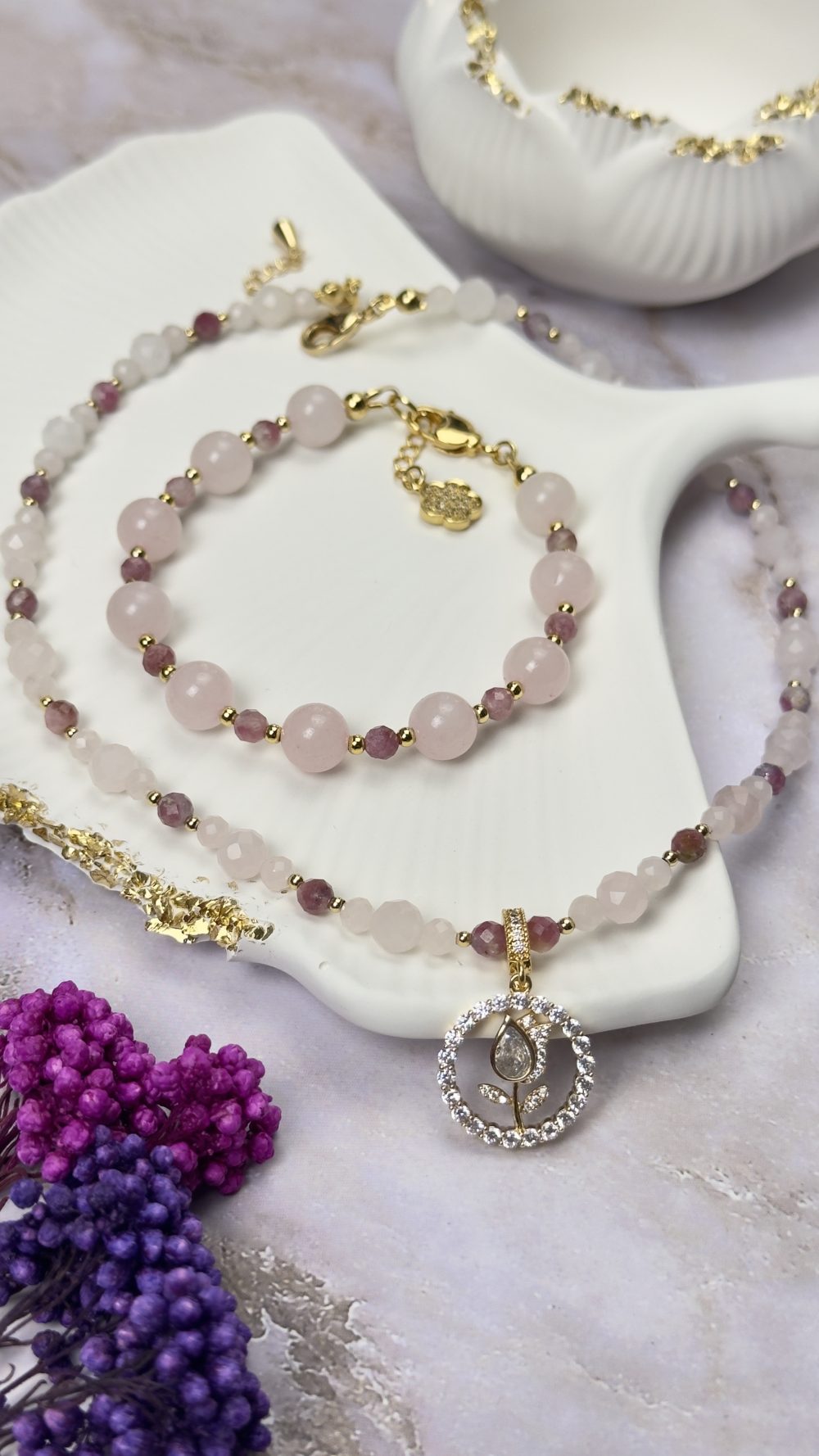 Состав изделия: мадагаскарский розовый кварц в огранке, розовый турмалин в ювелирной огранке, подвеска на выбор (сердце, роза, тюльпан)