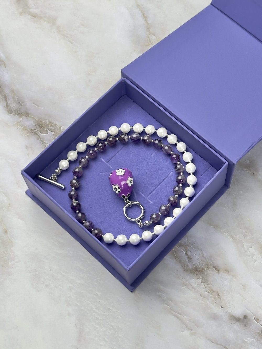 Колье олицетворяет весеннее пробуждение и светлые пасхальные традиции. Оно выполнено из натурального аметиста, излучающего нежный лавандовый свет, и жемчуга майорка с его нежным сиянием.