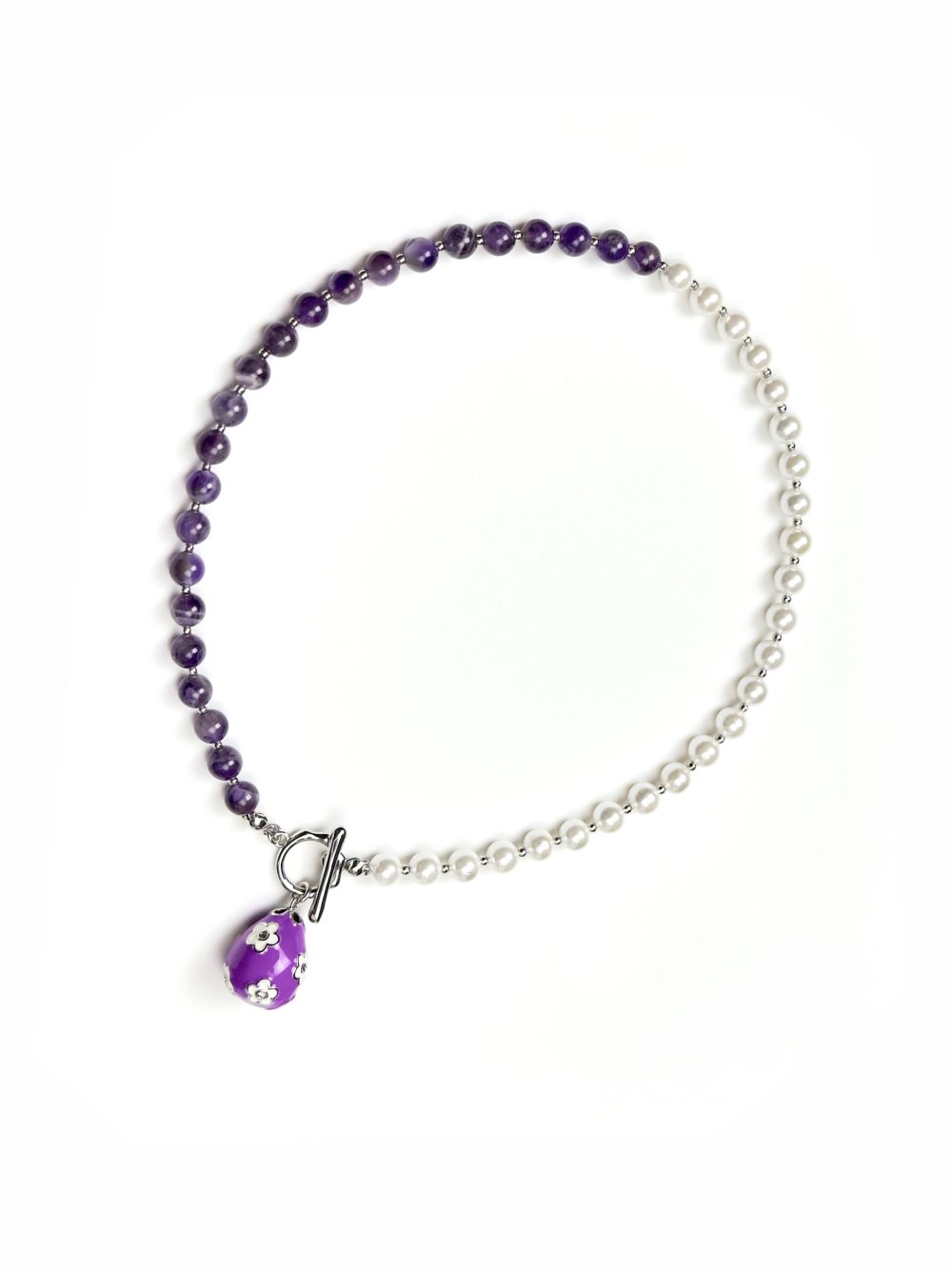 Состав изделия: аметист, жемчуг майорка, замок-тогл (в ассортименте), подвеска Пасхальное яйцо в фиалковом цвете, инкрустированная фианитами