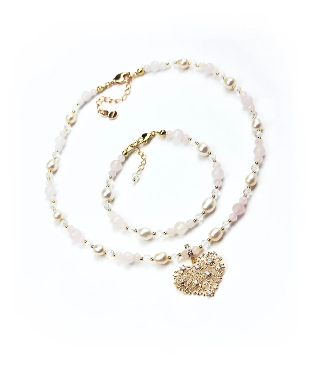 В этом наборе соединены три начала женственности: мягкое сияние жемчуга, теплота розового кварца и кристальная чистота горного хрусталя.