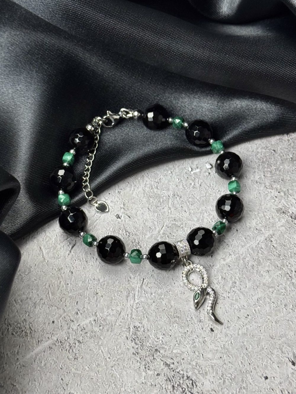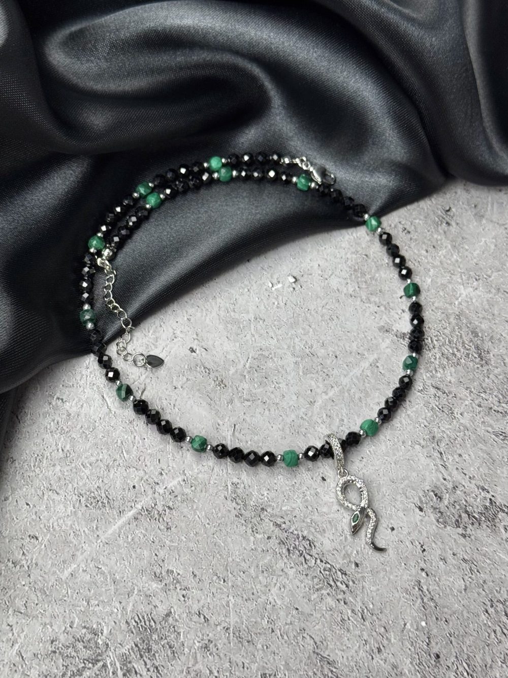 Состав изделий:  агат, черная шпинель, малахит в форме кубов в ювелирной огранке, инкрустированная подвеска в виде змейки с зеленым фианитовым глазком