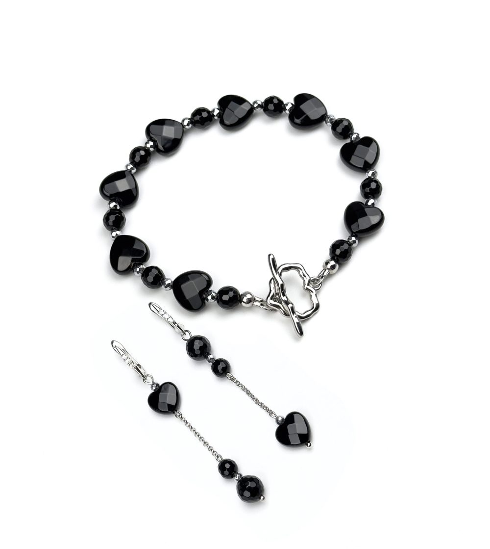 Состав изделия: черный граненый агат, граненый агат в форме сердец, гематит, фурнитура премиум-класса